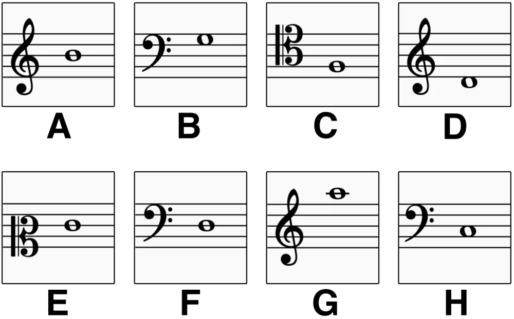 Diesen Ton kennst du – es ist ein D. Doch wusstest du, dass es in verschiedenen Lagen und Notenschlüsseln unterschiedlich notiert wird? Wähle alle Noten aus, die ein D sind.